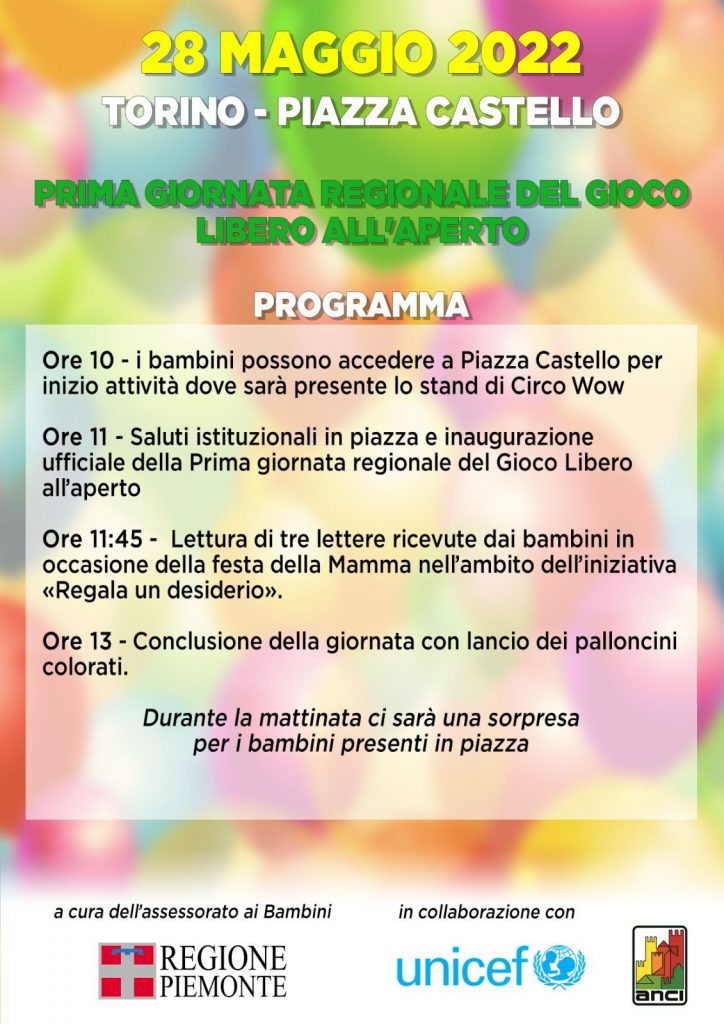Sabato 28 maggio 2022 la Regione Piemonte (Assessorato ai bambini), in collaborazione con UNICEF Italia, dalle ore 10 alle ore 13 in piazza Castello a Torino propone la Prima Giornata regionale del gioco libero all’aperto. Sono invitati anche tutti gli #Oratori. Il programma nella locandina a fondo pagina.